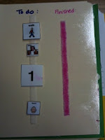 2.ย ย ย Mini Schedule: 2 velcro strips. The white strip should always contain the jobs she is to do for the immediate time being. For example, Walk to Speech (picture of walk, picture of Speech), Do task folder 1 (picture of 1), then break (picture of smiley break).